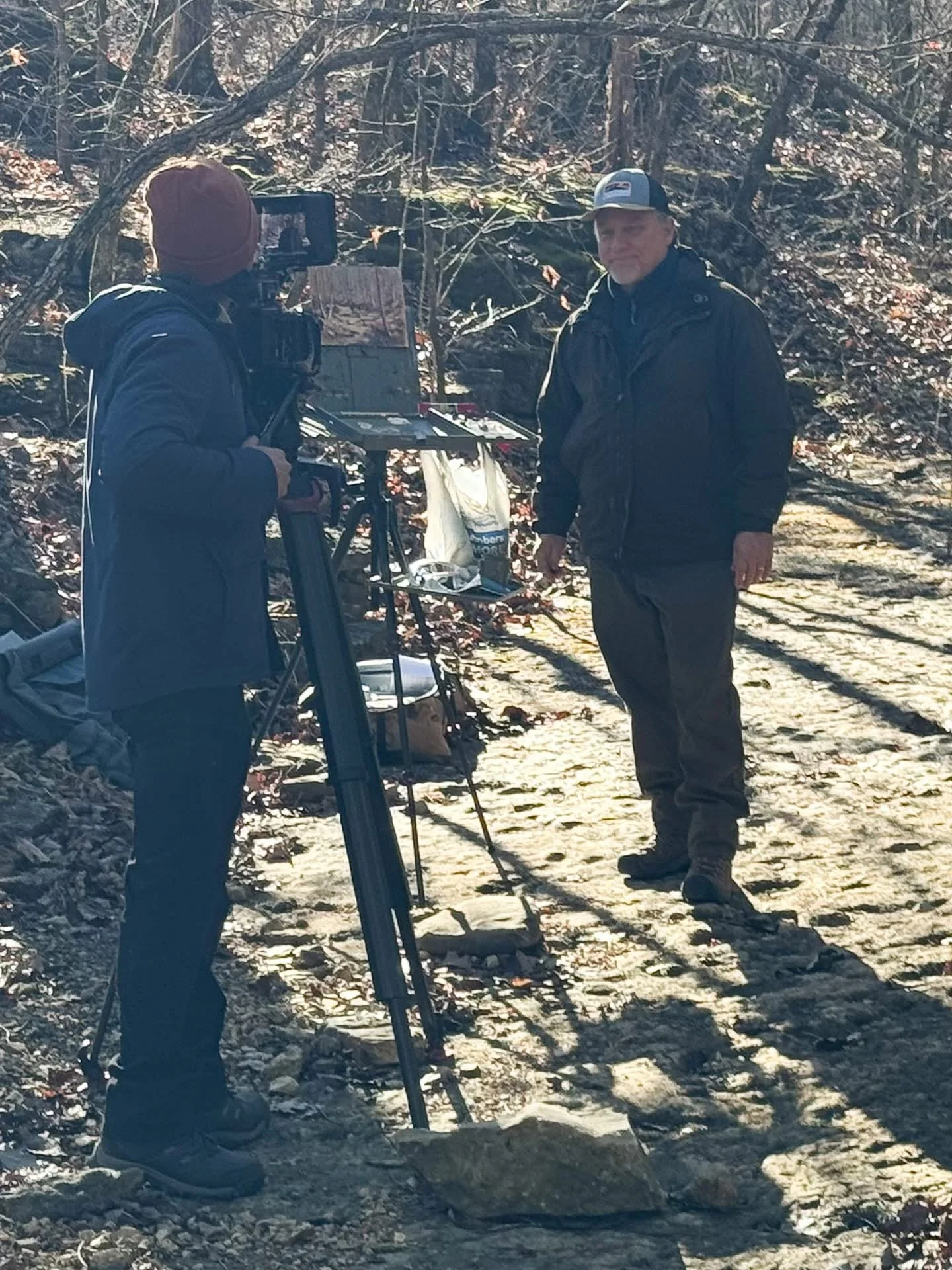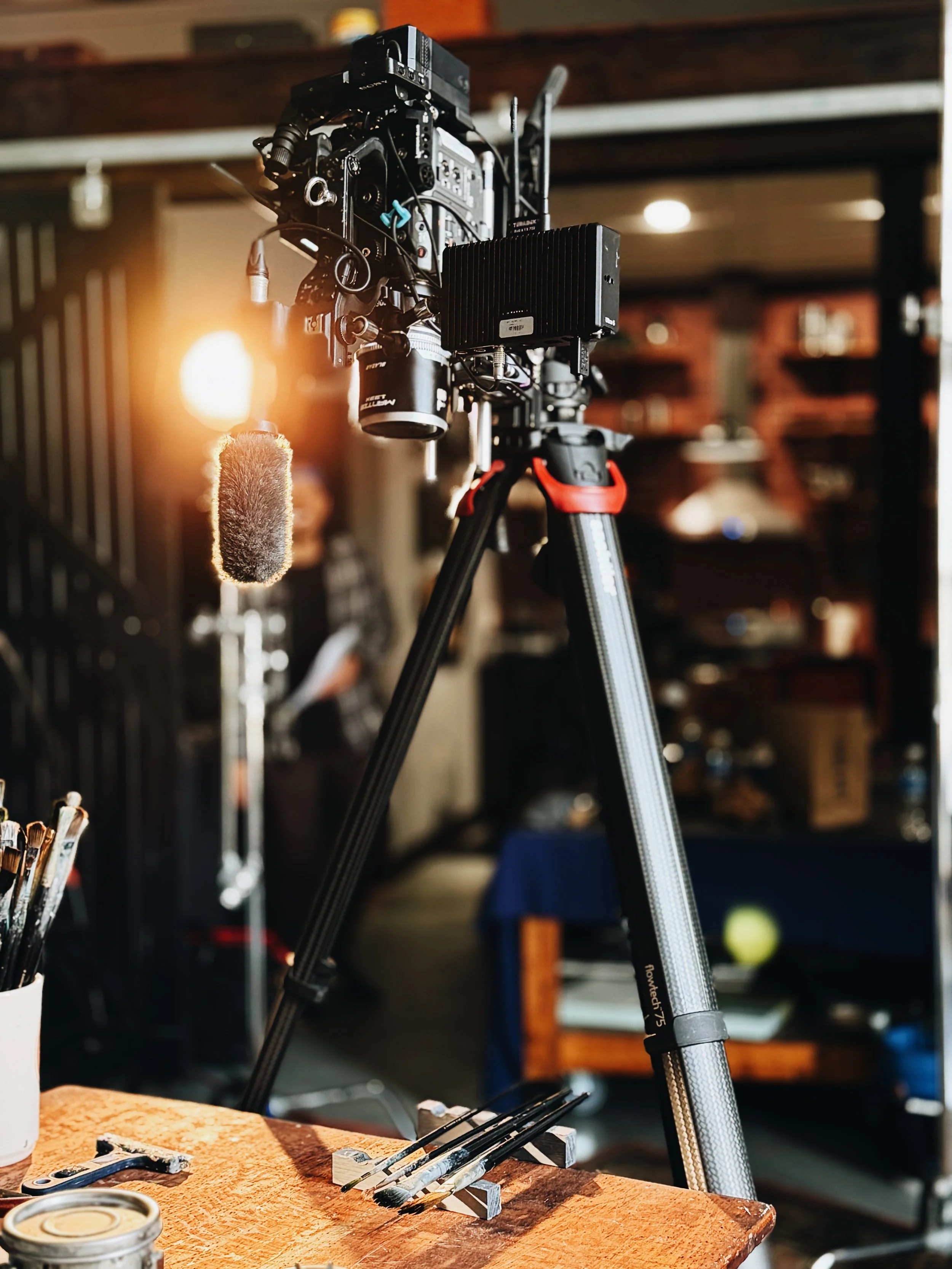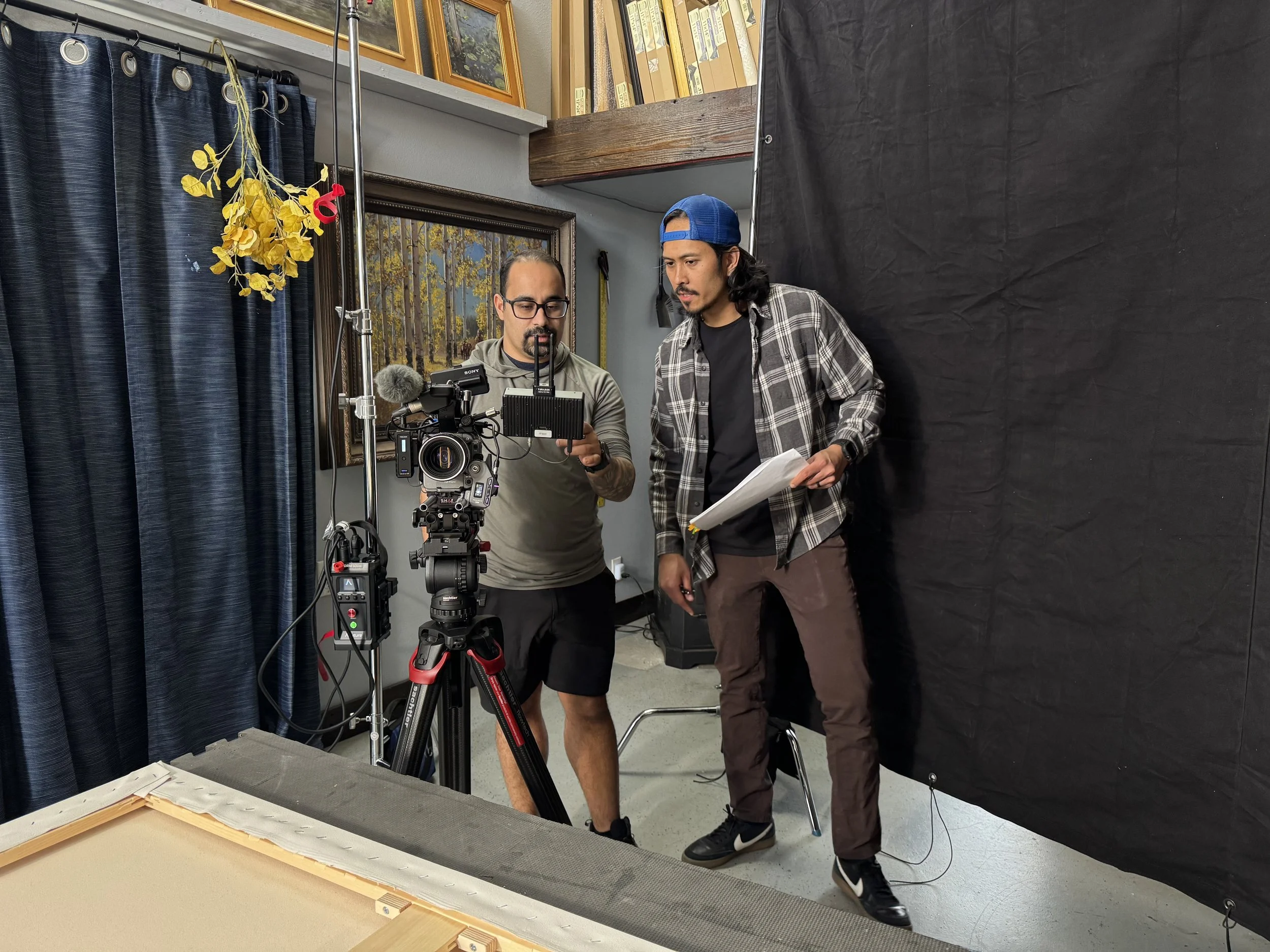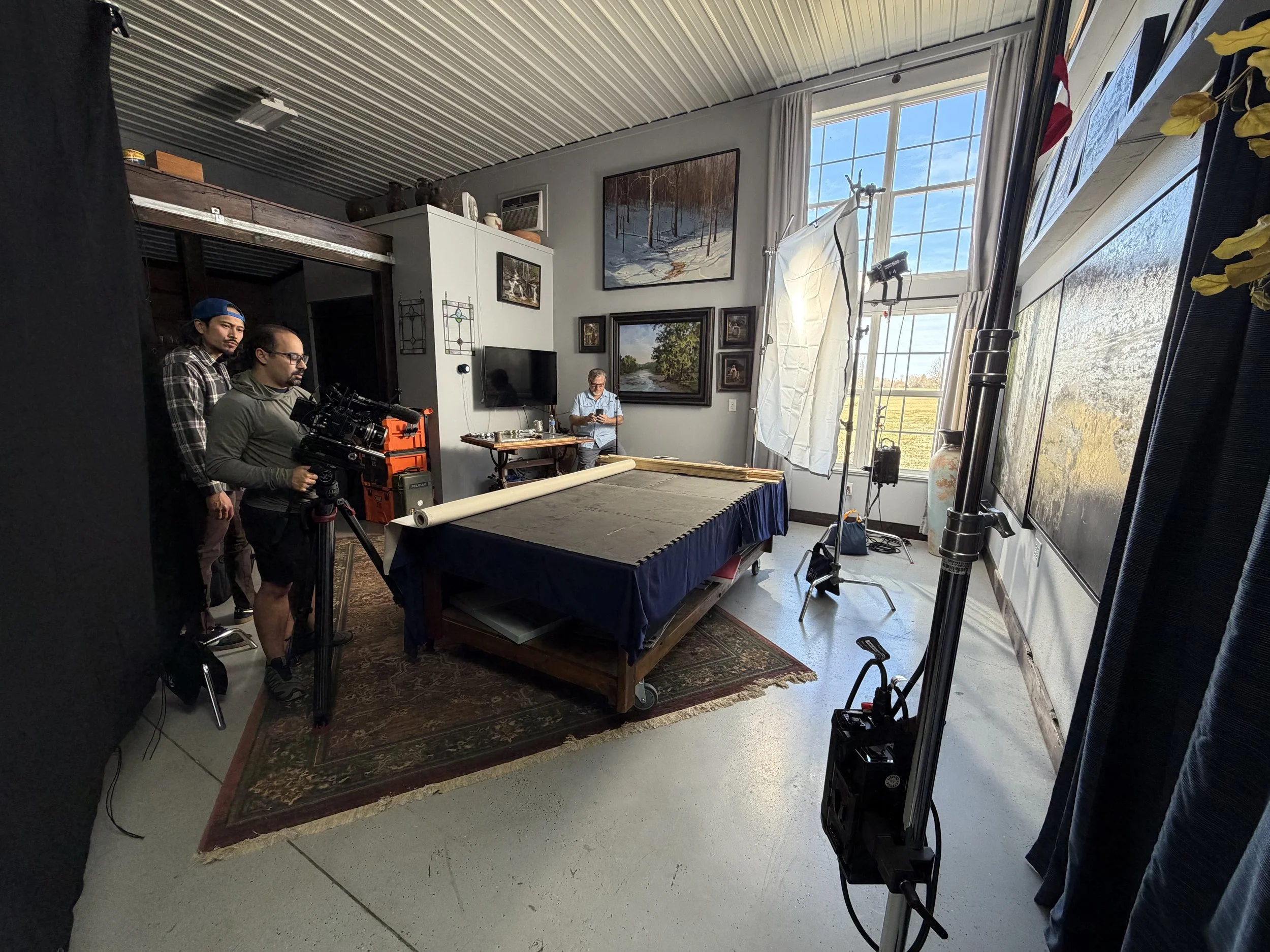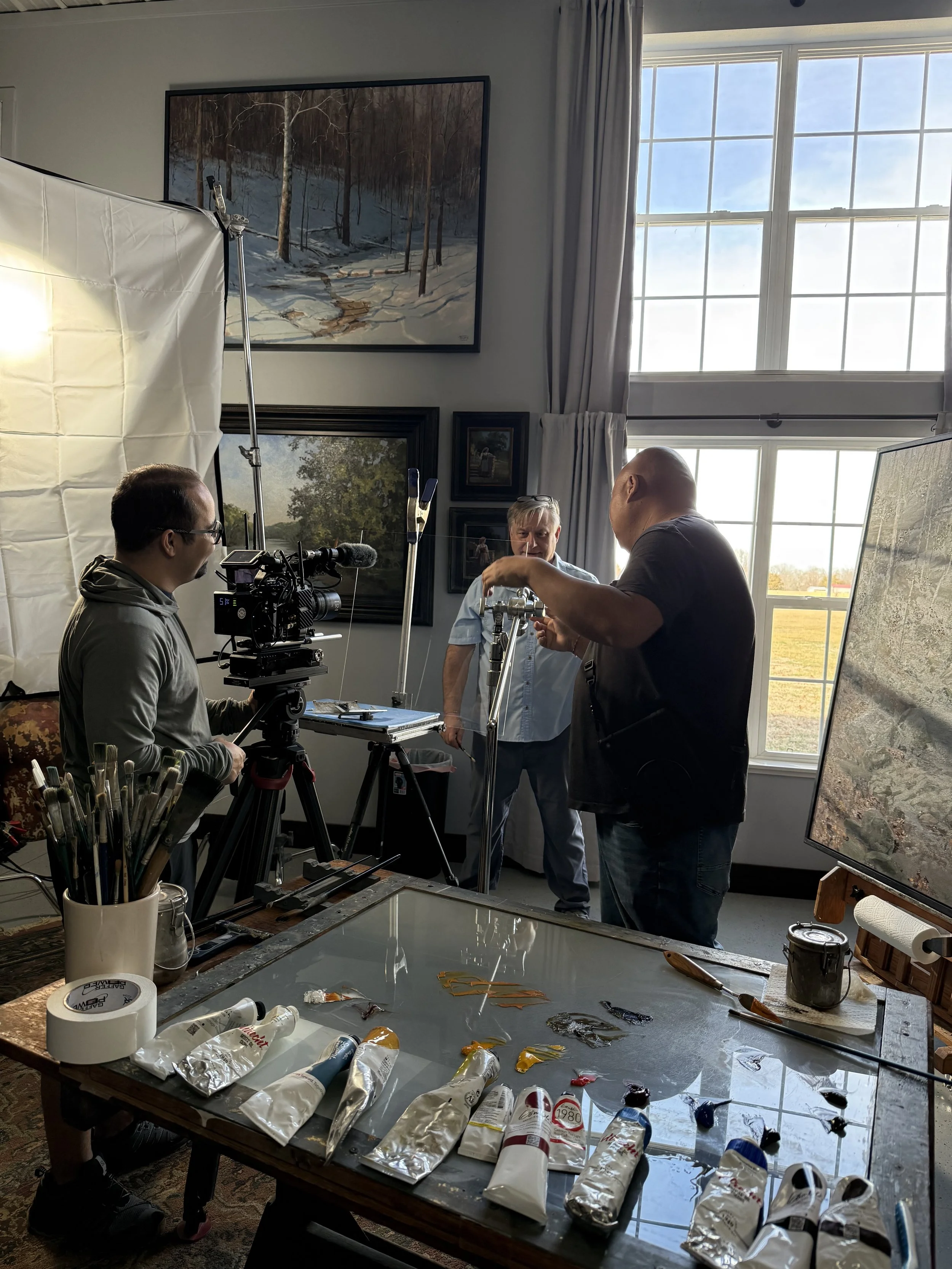 Outdoor scene was planned in early morning light, and Tim showed us his usual spots for painting. A small crew was used for the indoor scene to make camera work, lighting, and logistics run smoothly. All members of crew were handed a production packet, that had detailed diagrams, shotlists, and information needed to achieve an efficient shoot. All preproduction was meticulously prepared for weeks prior to shoot.